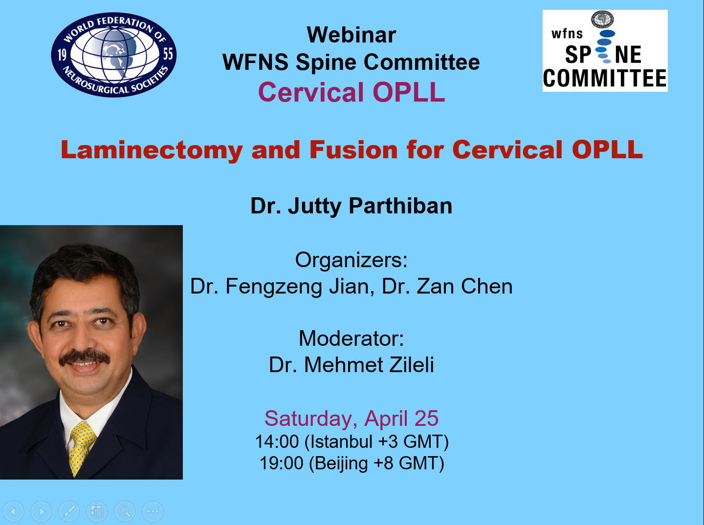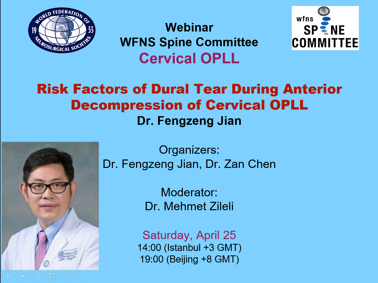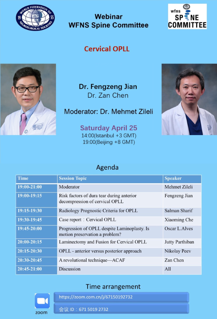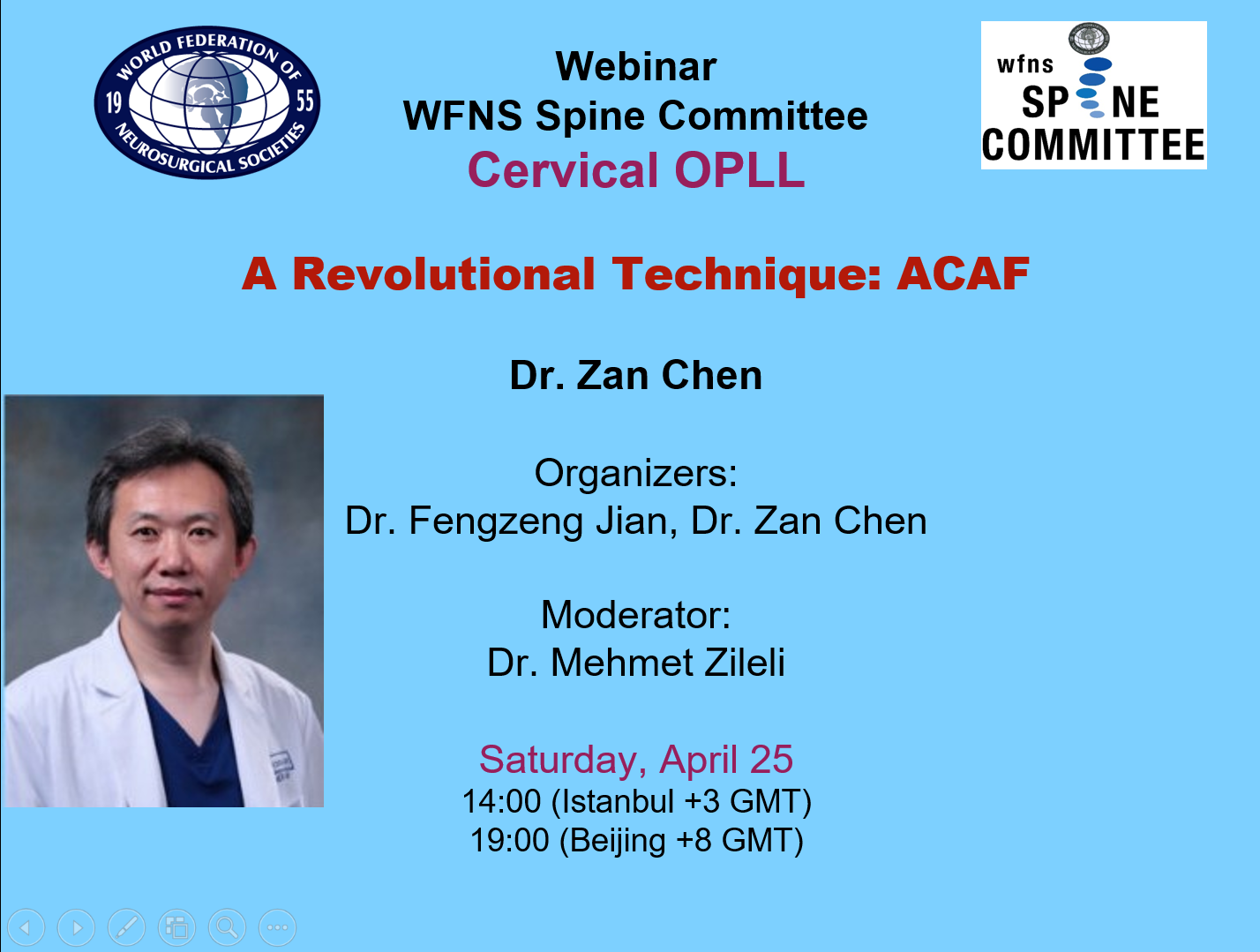 25th April 2020, Saturday: This is a webinar organized by "WFNS Spine Committee". With great thanks to Dr.Fengzeng Jian and Dr.Zan Chen from China International Neuroscience Institute, Beijing, China.