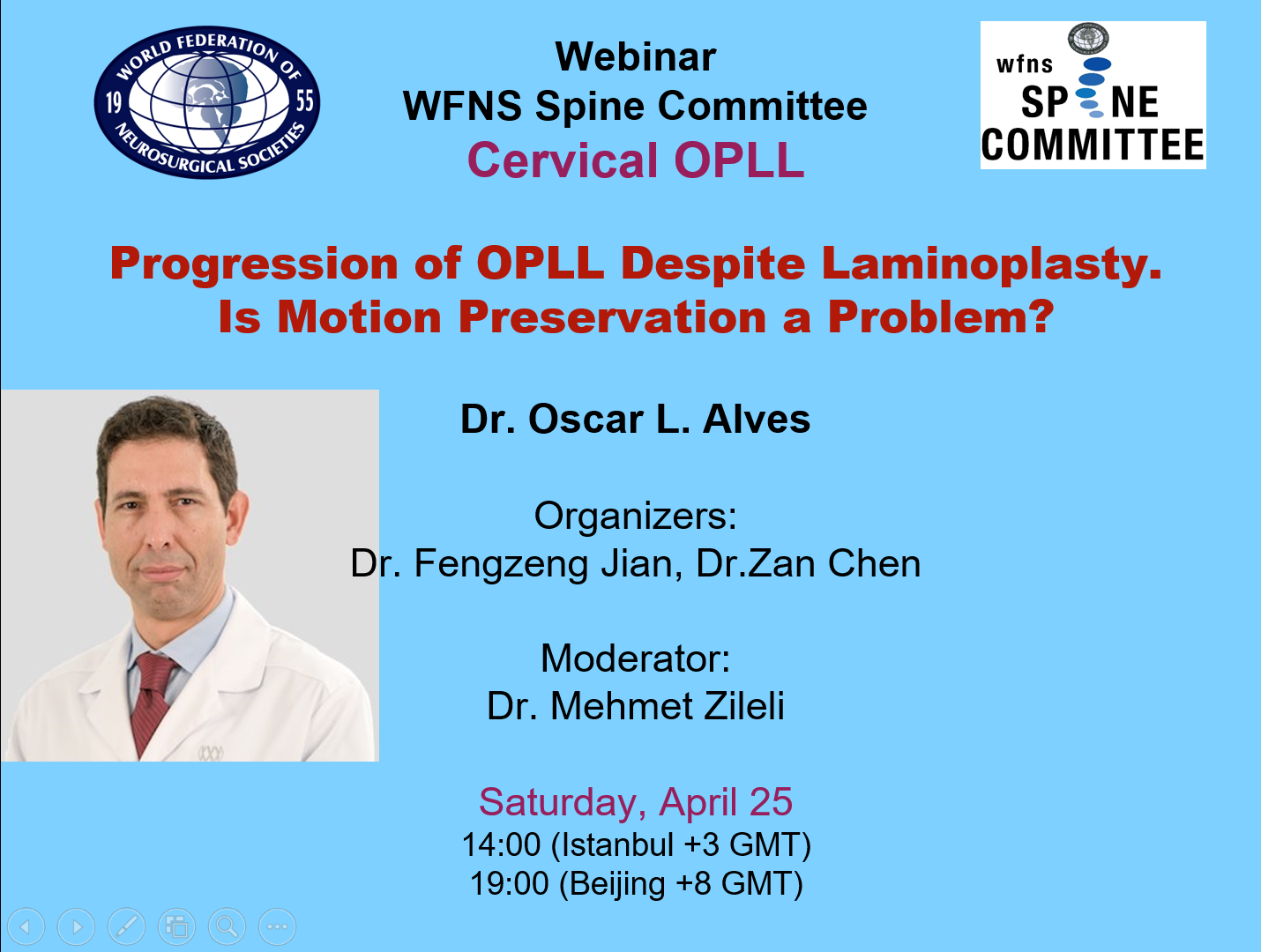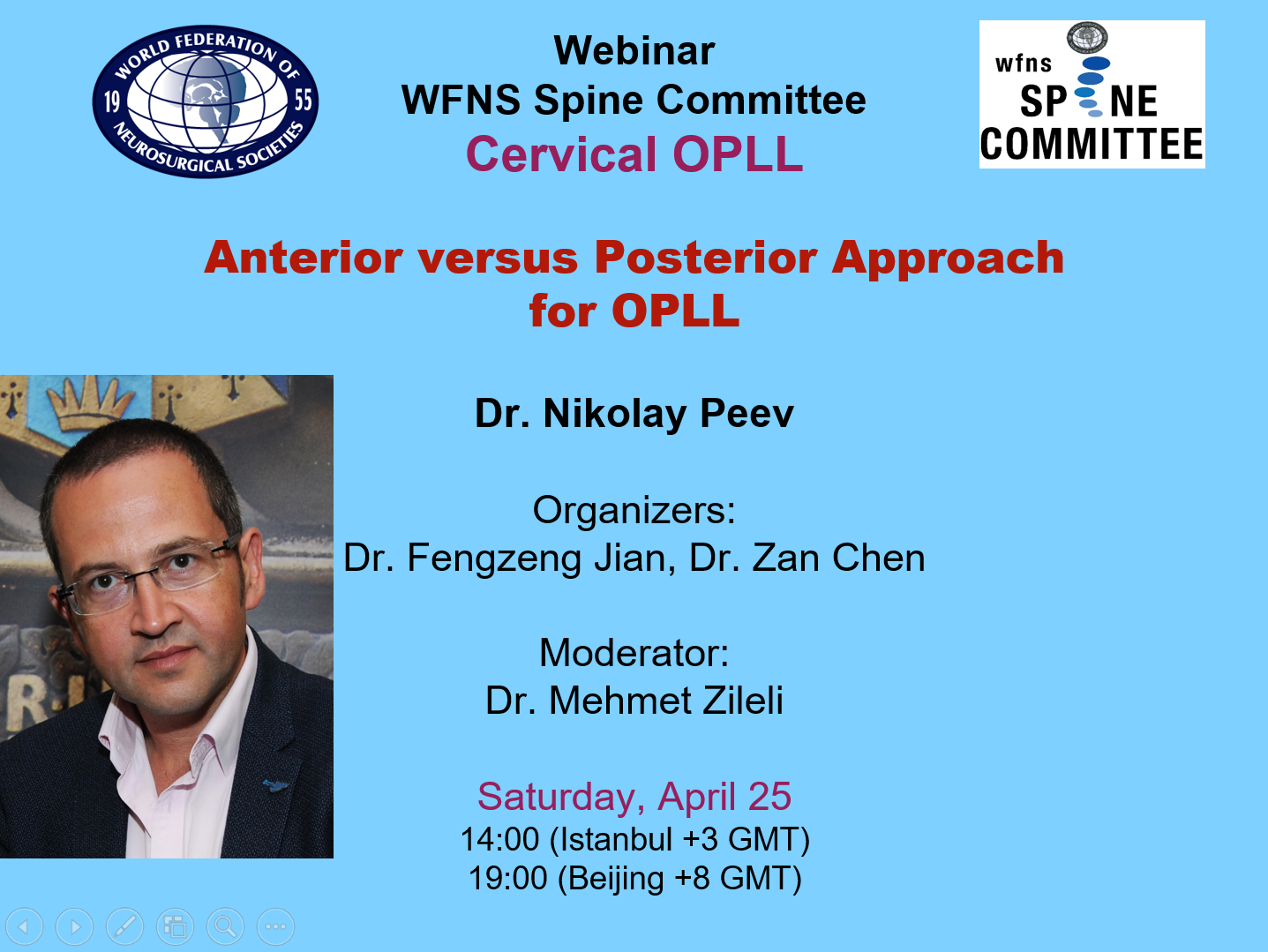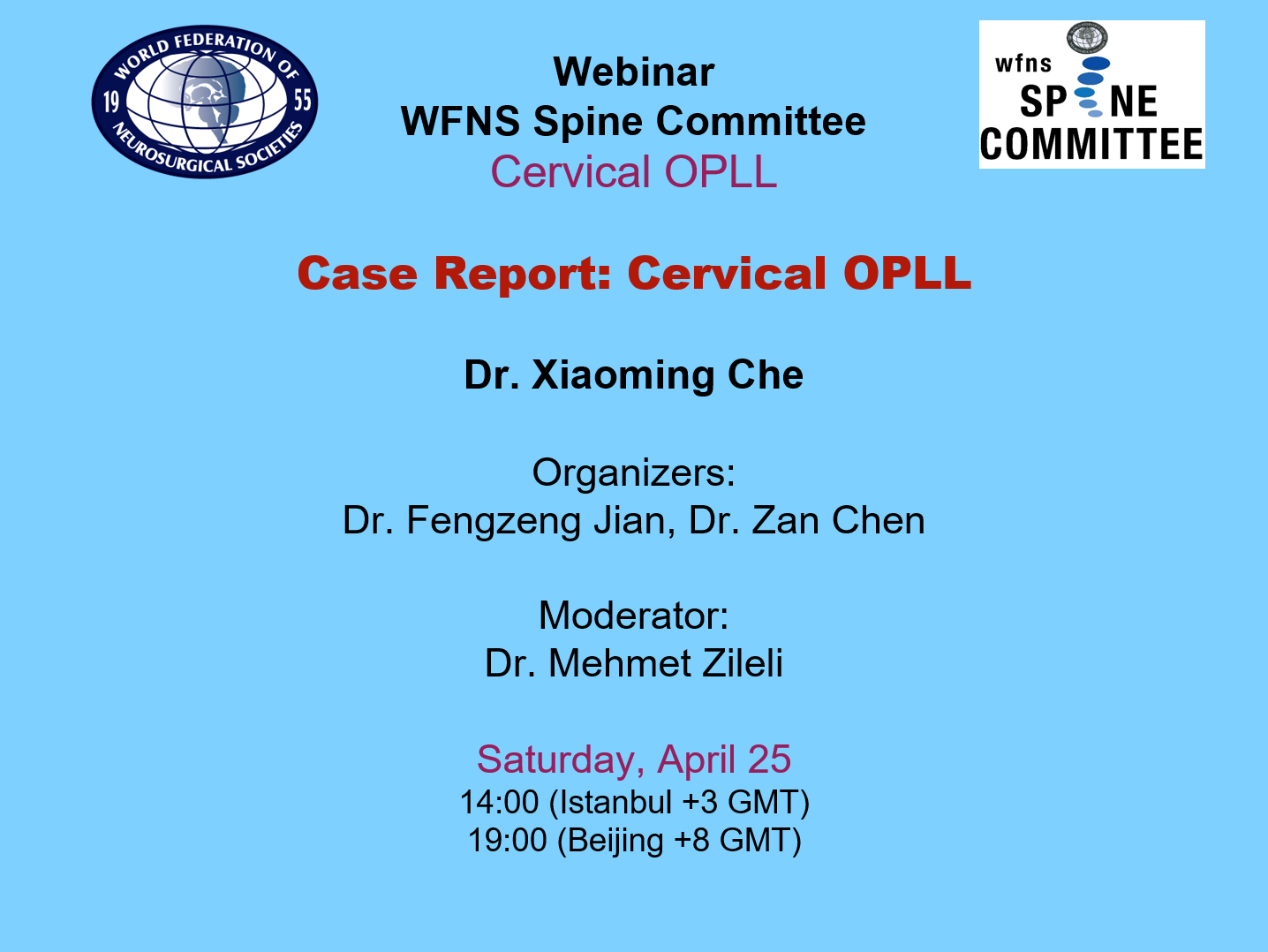 25th April 2020, Saturday: This is a webinar organized by "WFNS Spine Committee". With great thanks to Dr.Fengzeng Jian and Dr.Zan Chen from China International Neuroscience Institute, Beijing, China.